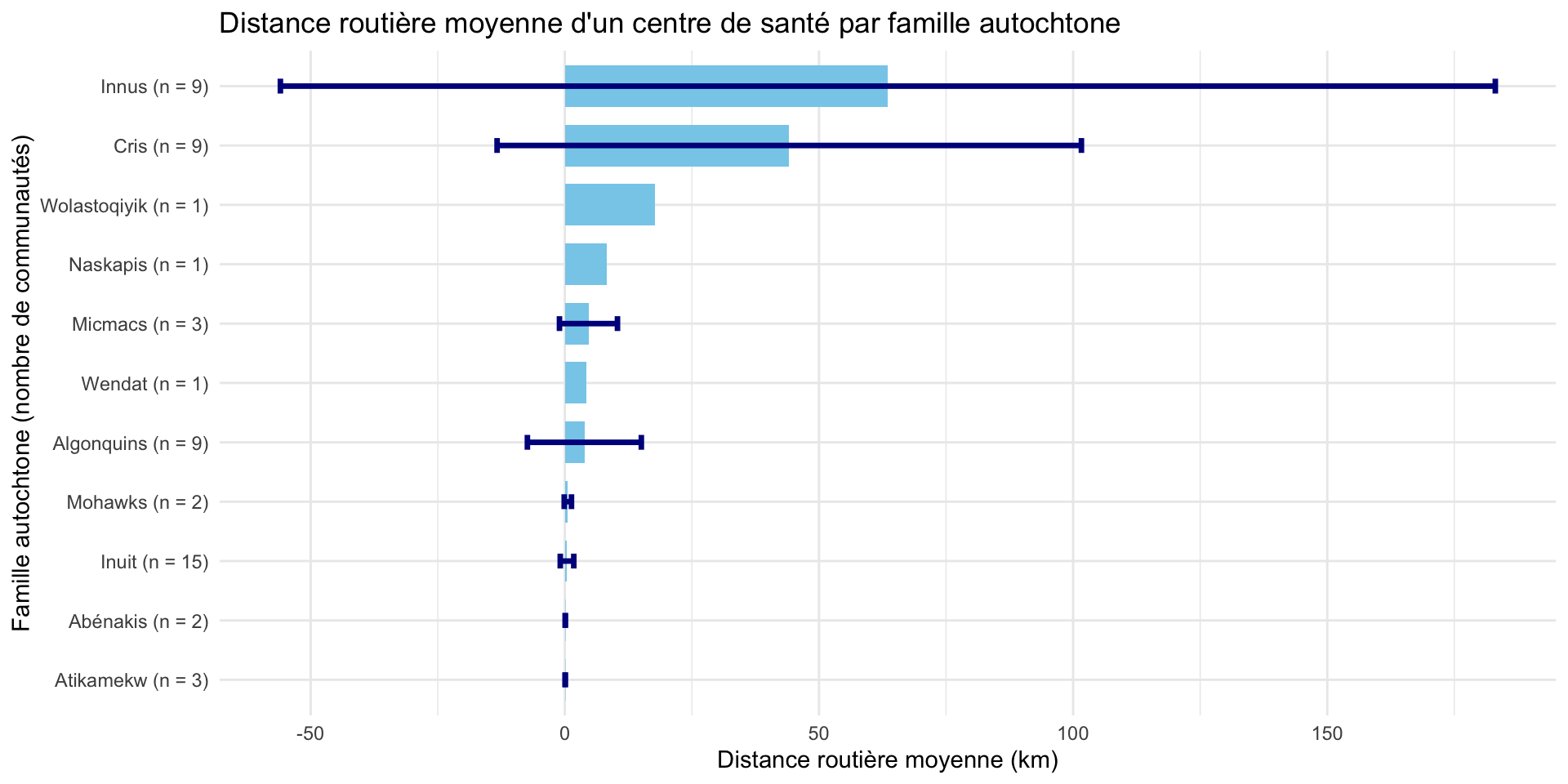 Exemple pour calculer les distances moyennes entre les principales communautés autochtones du Québec et les services de santé les plus proches. Erreurs possibles : IA a récupéré les adresses.